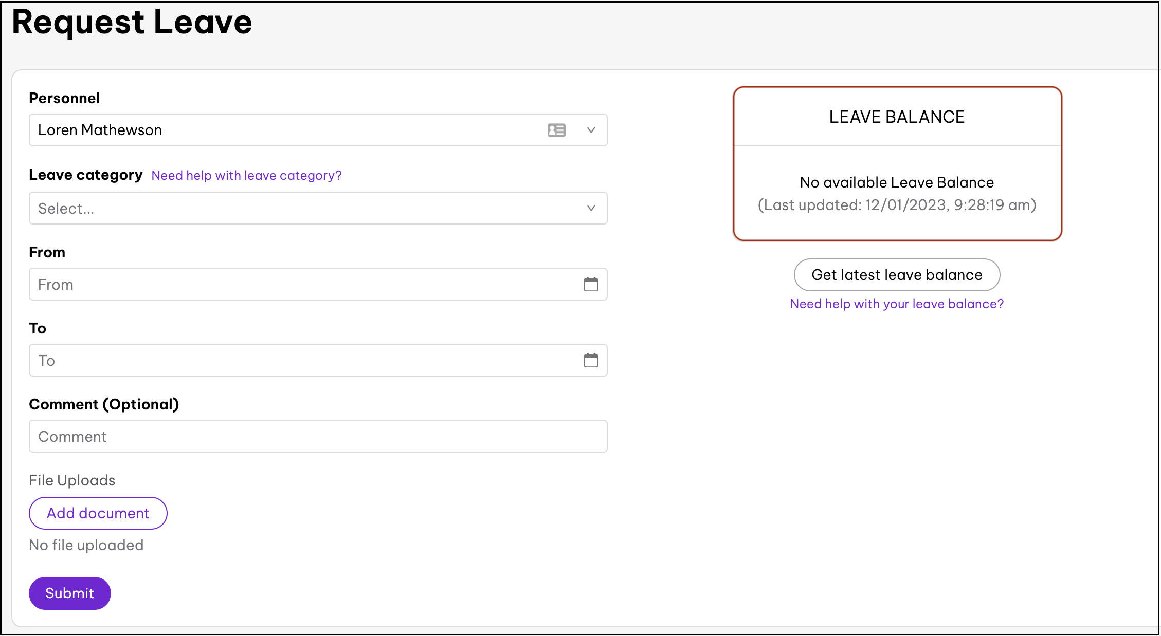 When applying for leave, you will be able to select which person the leave request is associated with. By selecting your Global Teams employee, you will then be able to view their leave balance on the right of the screen.