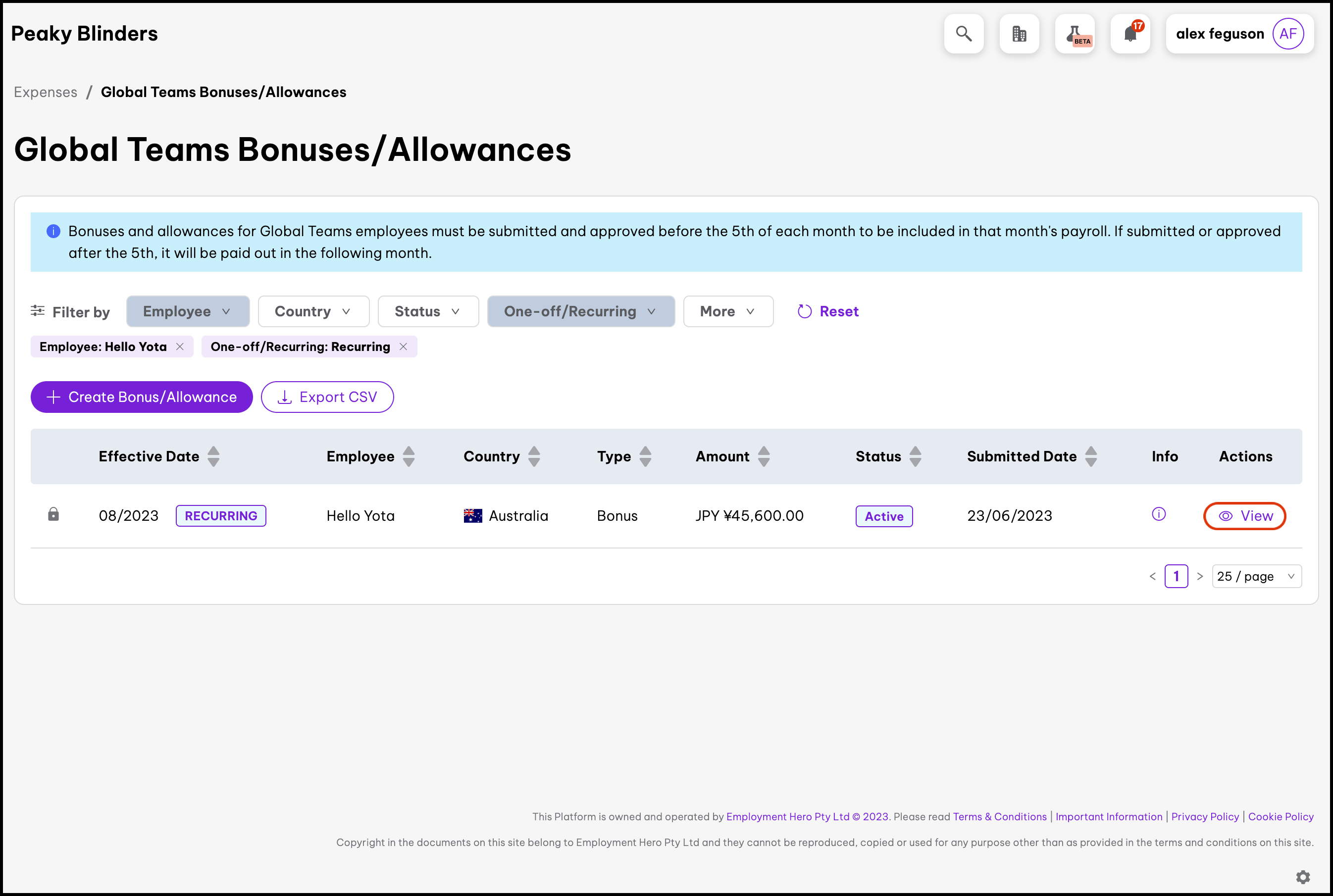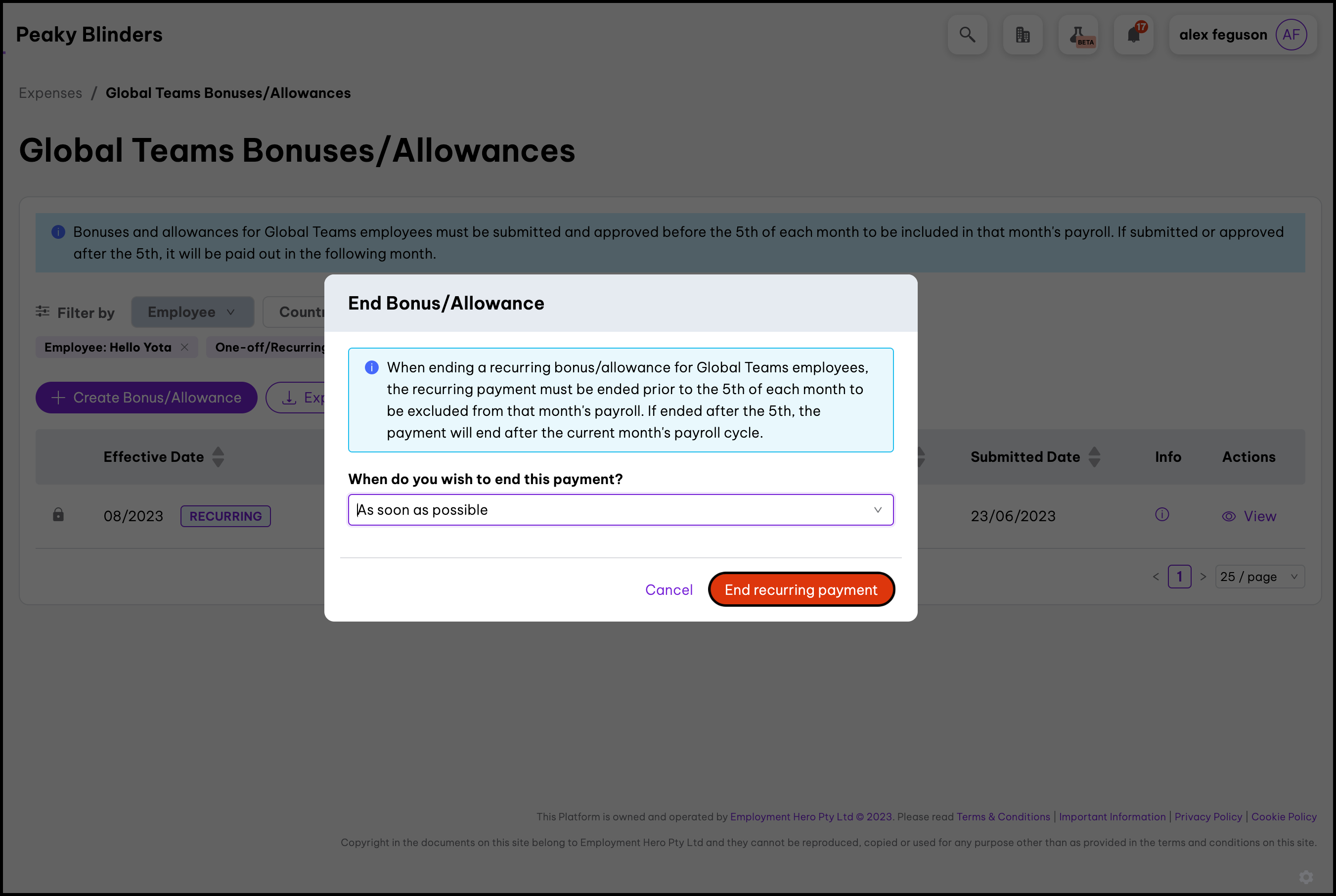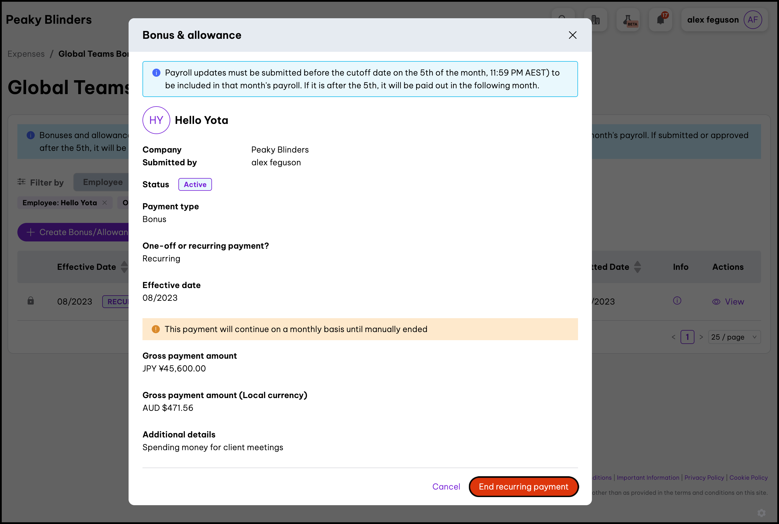 You can only end a recurring bonus/allowance if shows an Active status. If you can not see this status message or you ended iit in the past, we wil not show the End recurring payment button. When ending a Global Teams employee's recurring bonus/allowance, end it by the 5th of the effective month to exclude it from that month's payroll. Once you end a recurring payment, you will be able to see the final payment date by clicking the View button.