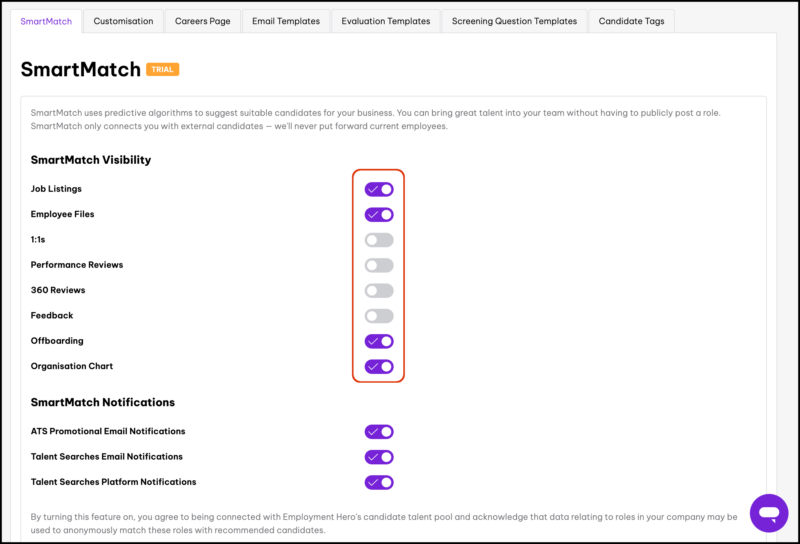 The SmartMatch Visibility and Notifications feature allows you to control where SmartMatch Placements appear within your platform. For example, you can disable it in the 1:1 feature but enable it in the employee file feature. It also lets you customise notifications, such as opting in for ATS Promotional Email Notifications. SmartMatch is included in your paid Employment Hero subscription as a pre-release trial at no extra cost for viewing candidate recommendations or hiring recommended candidates. We are continuously improving SmartMatch to optimise talent acquisition, with full release details to be announced shortly.