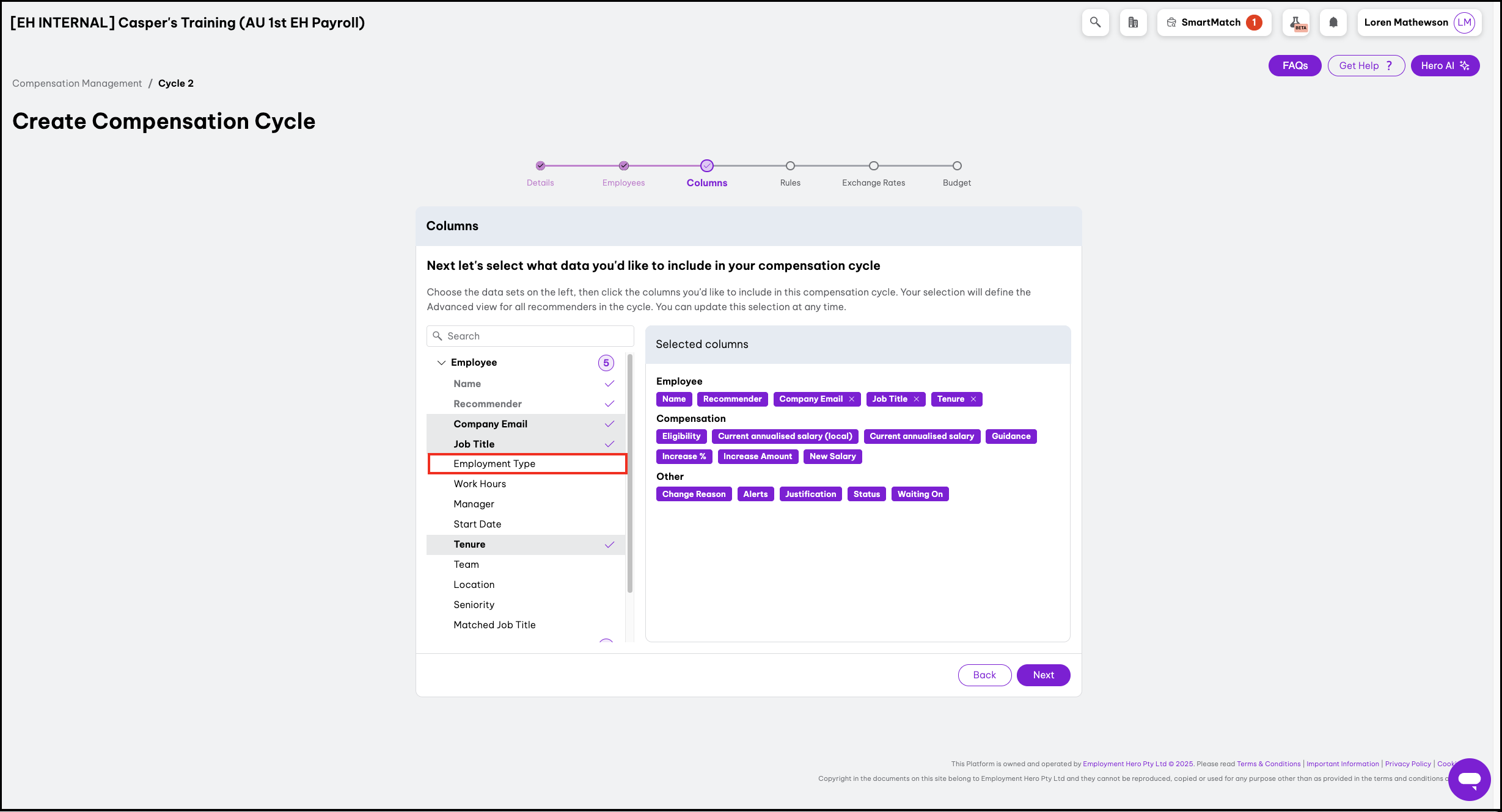 - Next, in Columns, select what data you would like to include in your compensation cycle for consideration. Click on the right hand-facing arrow to expand the datasets in the topic.