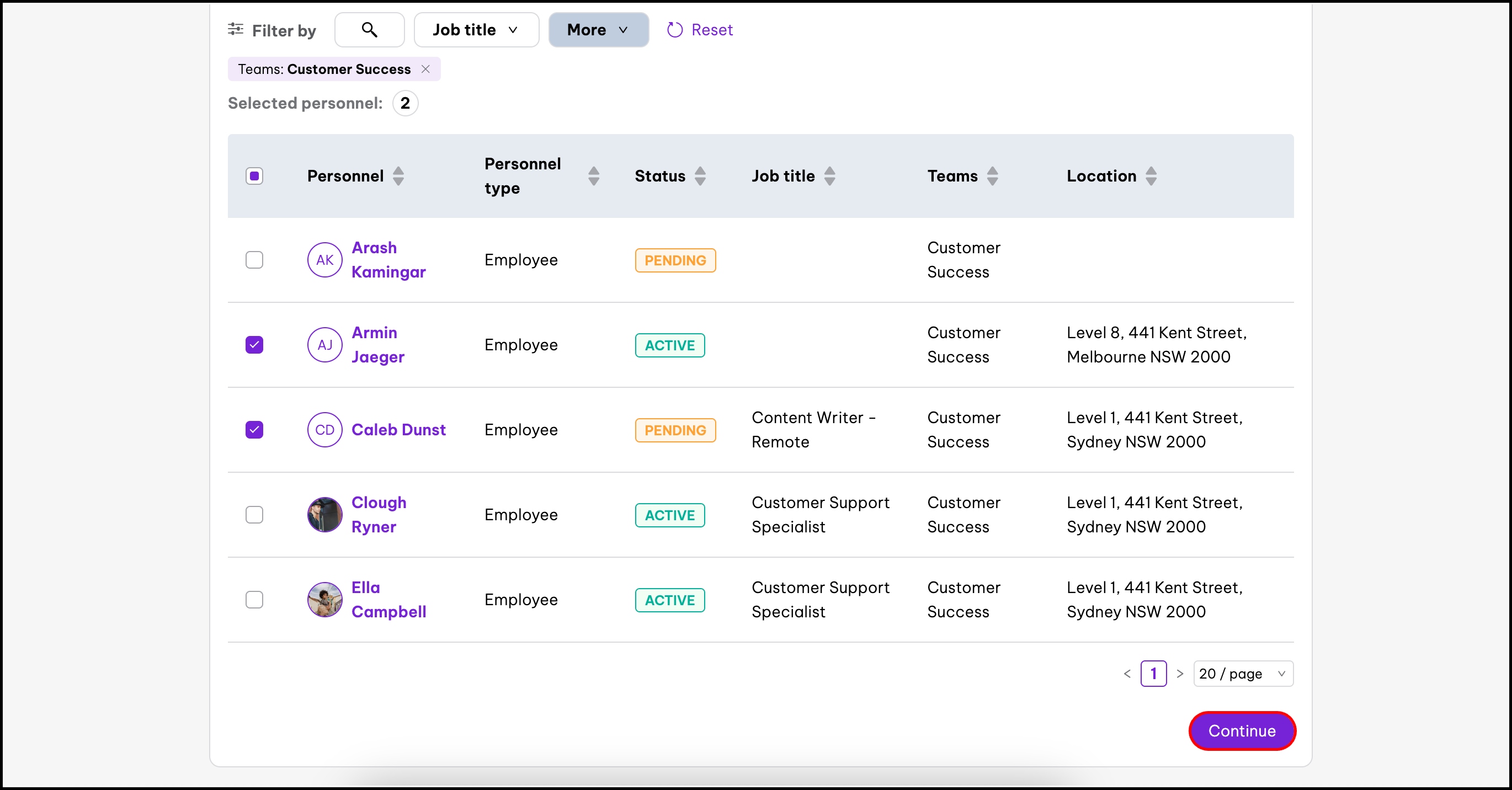 - You can filter the employees by: Job Title, Employing Entity, Employment Type, Teams, and Locations.