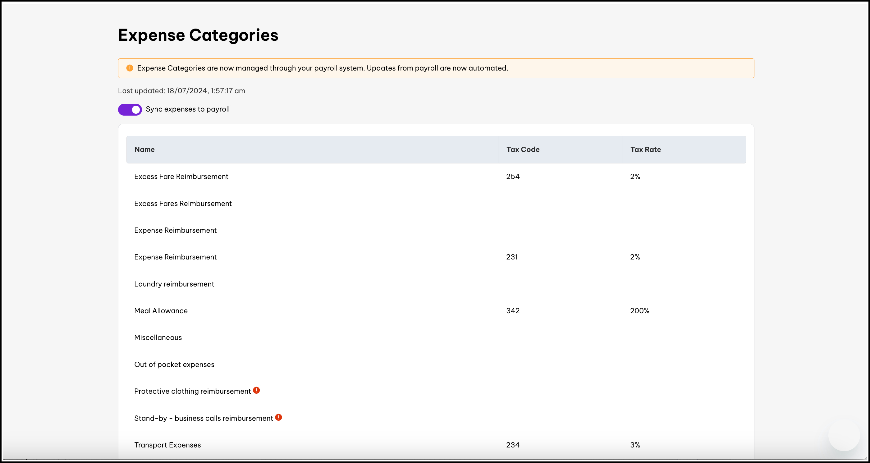 - You will now be on the Expense Categories page. Here you can see an updated list of your expense categories from your payroll platform.