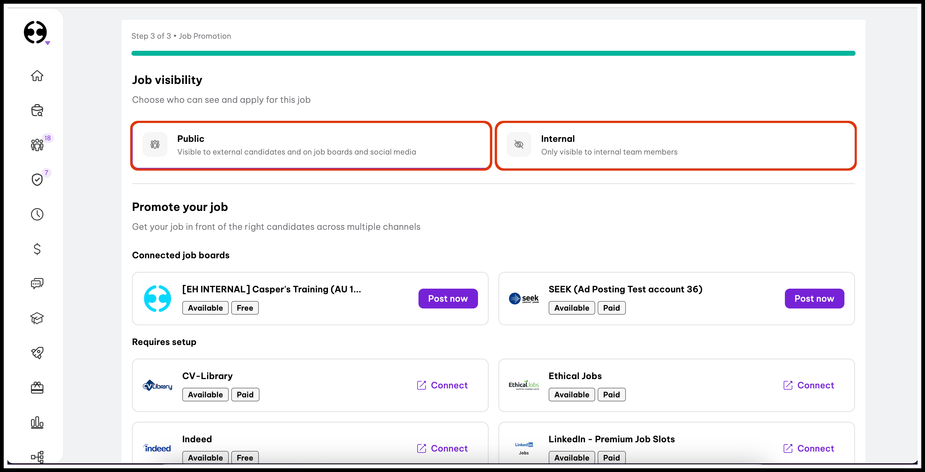 This final step allows you to choose who can see and apply for your job, and which job boards you want to post it to.