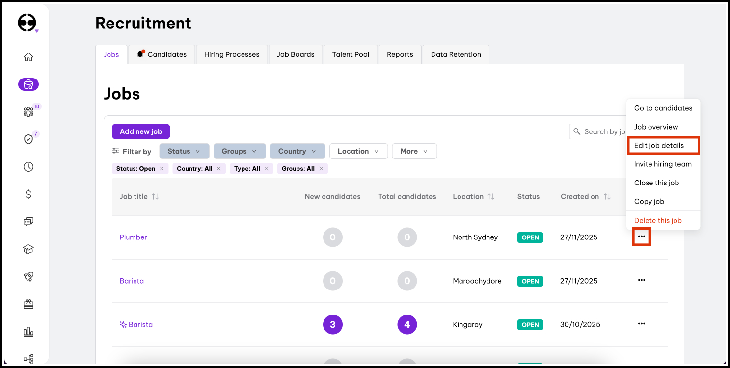 - Click on the job title or click the three dots menu […] and select Edit job details.
