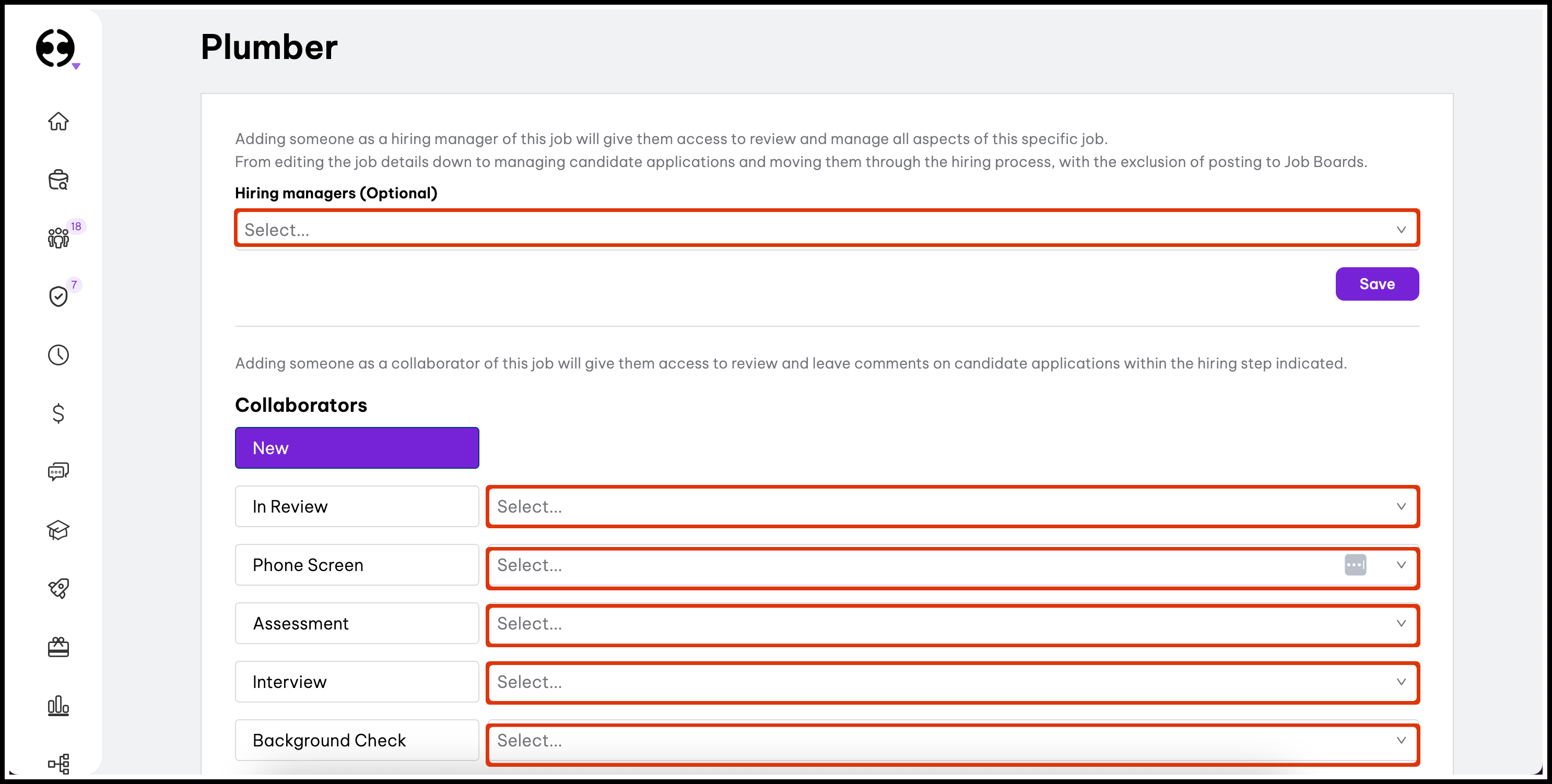 - Select Collaborators for different hiring stages (In Review, Phone Screen, Assessment, Interview, Background Check, Offered, Hired, Disqualified) - These users can review and leave comments on candidate applications at their assigned stage