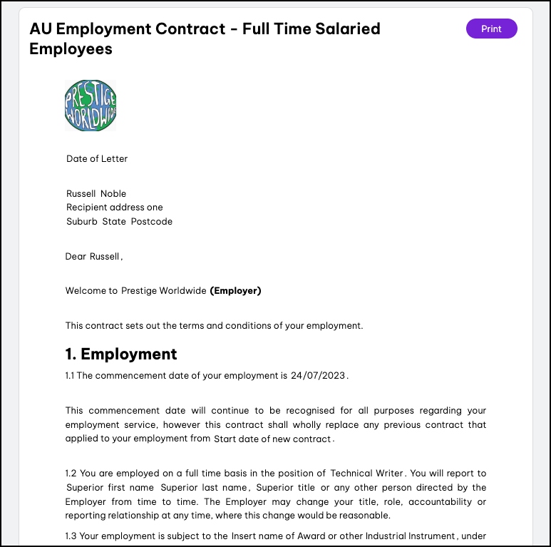 The 'My Documents' feature is where you can find and print your important employment documents, such as your employment agreement and policies, once they are finalised or awaiting your signature. Employees can only see their own assigned documents here; administrators or managers need to go to the employee's profile to view them.